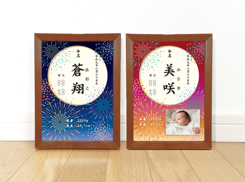 夏の季節の命名書月夜の花火と夕暮れの花火